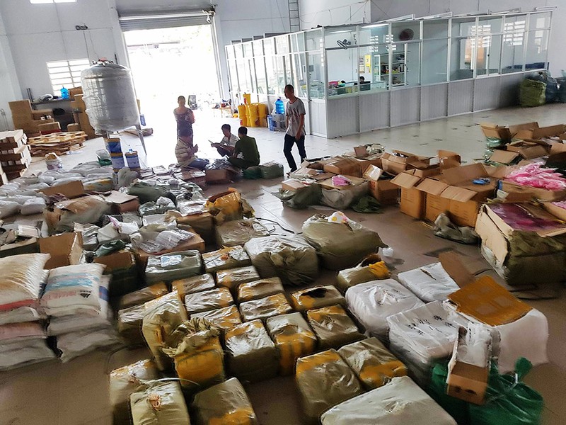 Cảnh sát ập vào khám xét container cùng kho hàng của công ty này, phát hiện nhiều hàng hóa không có hóa đơn, chứng từ. Ảnh: CA